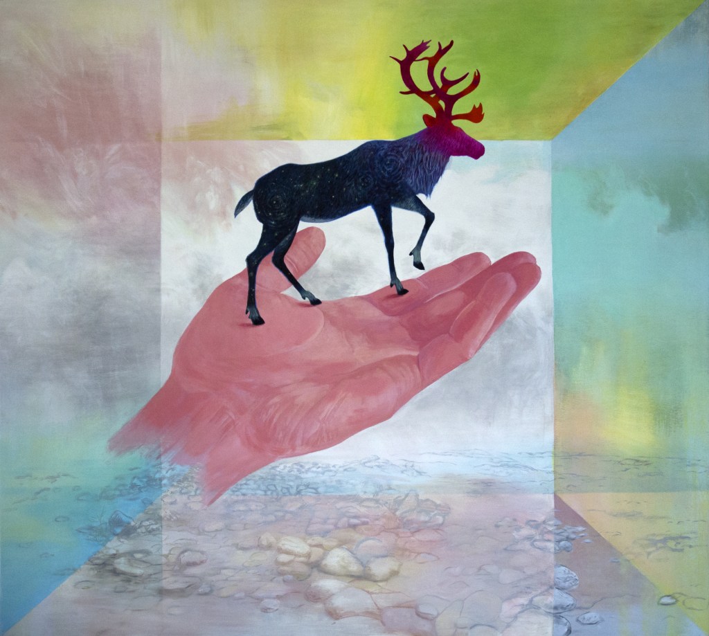 Caribou et moi, huile sur panneau, 101,5 x 91 cm, 2022. Vendue