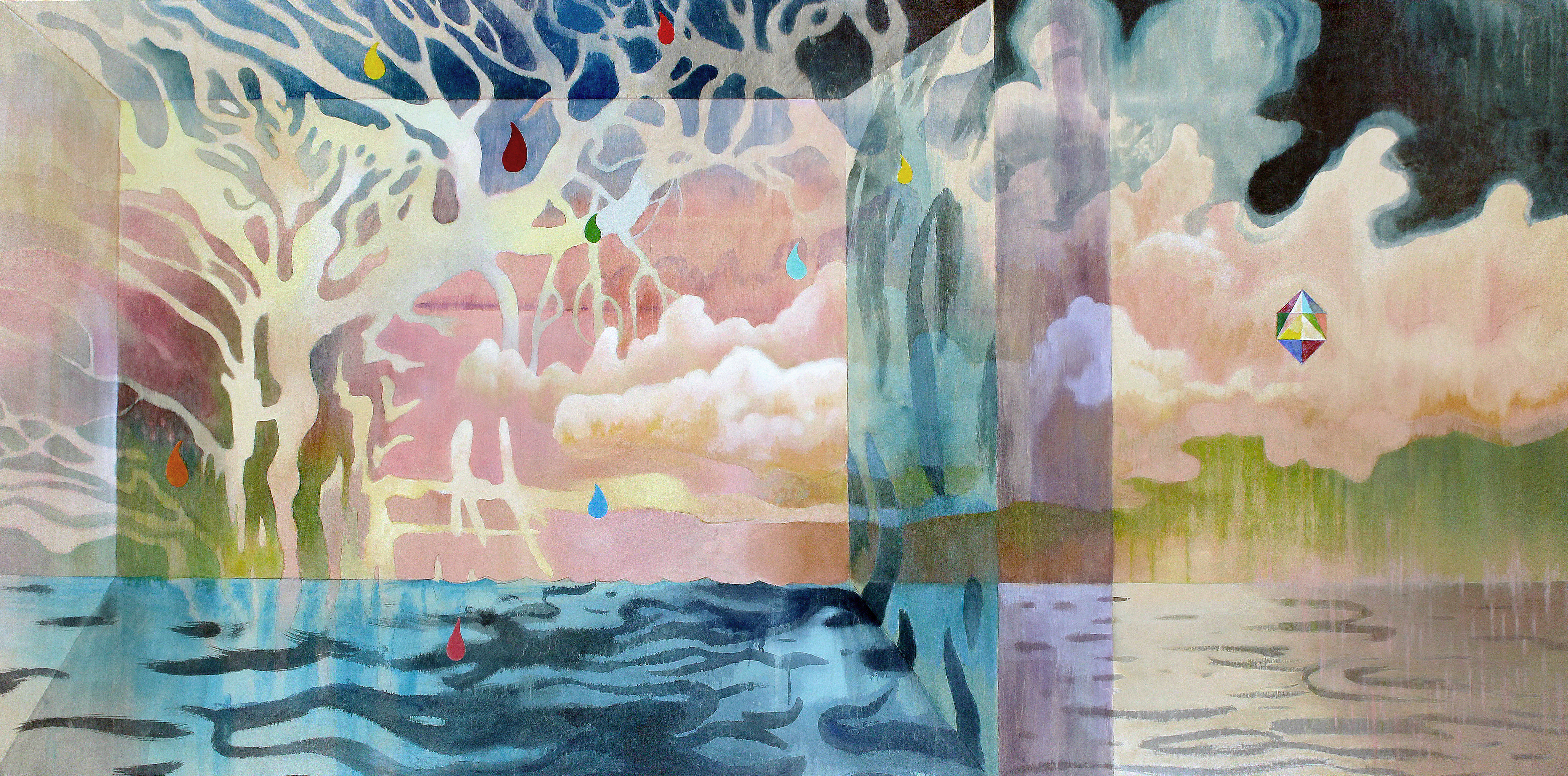 Cueillir la pluie, aquarelle et huile sur panneau, 91 x 183 cm (3 x 6 pieds), 2022. 2800 $