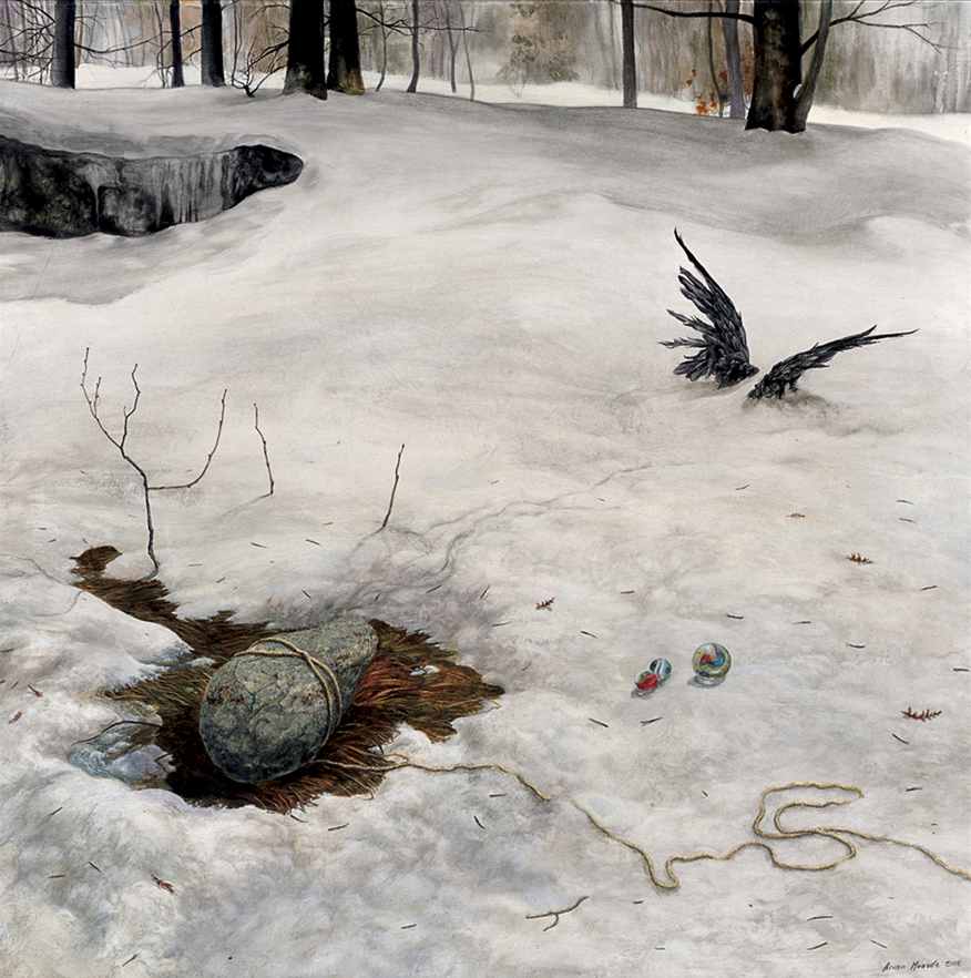 « Le piège » ou « Conte d’hiver » est une oeuvre fortement narrative, qui comporte une forme d’intrigue: « qu’est-il arrivé à l’oiseau? Pourquoi la pierre est-elle attachée, pourquoi les billes? Qu’est-ce que ça signifie? » Chacun peut chercher les indices pour trouver un sens aux éléments représentés. On remarquera peut-être que le pierre a la forme d’un oeuf, et que le trou dans la neige où elle repose évoque par sa forme un nid d’oiseau. Les billes évoquent l’enfance, le jeu. Est-ce une forme cruelle de jeu d’enfant? On peut aussi voir dans la neige, entre la pierre et l’oiseau, des traces dans la neige qui évoque le frottement d’une ficelle. L’oiseau a-t-il été attaché à la pierre? L’image ne permet pas que l’on réponde avec certitude aux questions qu’elle pose, elle tient à son mystère. Elle aussi joue avec le spectateur un jeu un peu cruel…