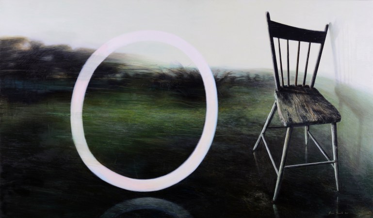 Ce tableau représente une chaise et un cercle dans un décor qui semble a priori être un paysage naturel. Par contre, on note des reflets sous les objets, une courbe étrange de ce qui serait l’horizon, ainsi qu’une ombre à l’endroit où le dossier de la chaise rencontre le ciel. Ces phénomènes questionnent la nature du décor dans lequel se trouvent les objets, sa réalité. D’autre part, la chaise et le cercle sont dans un rapport qui crée une tension dans le tableau. La première semble coincée du côté droit du tableau, alors que le cercle prend plus que sa part de l’espace. Une forme d’opposition définit leur relation: l’un est courbe et lumineux; l’autre, sombre et fait d’angles droits. La chaise est « mal assise » dans cet espace qui n’en est pas un, « adossée contre le ciel » et face à un cercle qui ne dit pas ce qu’il est.